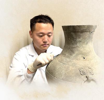 “这是铜罍,用来装酒的。”赵明辉低声介绍,“因为器物很大,坐着根本够不着,所以只能一直站立修复。”