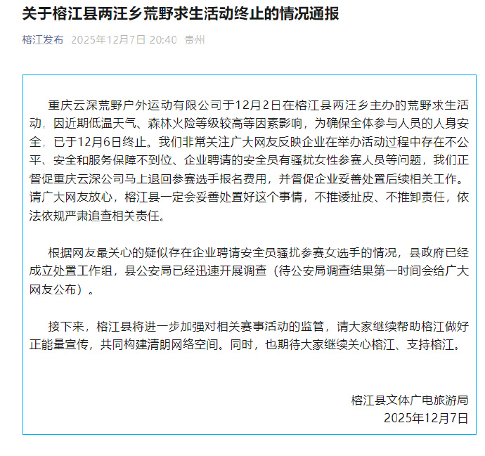 榕江县文体广电旅游局发布关于榕江县两汪乡荒野求生活动终止的情况通报:重庆云深荒野户外运动有限公司于12月2日在榕江县两汪乡主办的荒野求生活动,因近期低温天气、森林火险等级较高等因素影响智选+,为确保全体参与人员的人身安全,已于12月6日终止。我们非常关注广大网友反映企业在举办活动过程中存在不公平、安全和服务保障不到位、企业聘请的安全员有骚扰女性参赛人员等问题,我们正督促重庆云深公司马上退回参赛选手报名费用,并督促企业妥善处置后续相关工作。请广大网友放心,榕江县一定会妥善处置好这个事情,不推诿扯皮、不推卸责任,依法依规严肃追查相关责任。