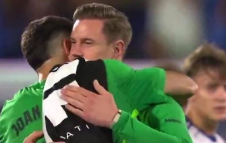 直播吧8月11日讯据《每日体育报》报道,巴萨队长特尔施特根在甘伯杯赛后和另一位巴萨门将霍安-加西亚拥抱。