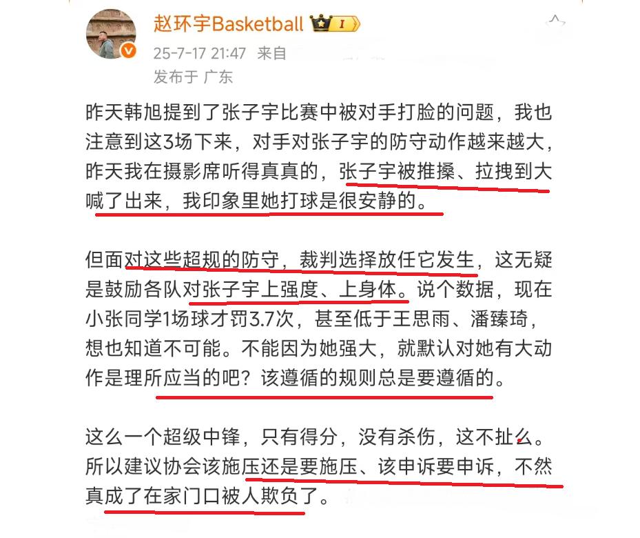 “这不是篮球应有的防守方式,张子宇被推搡、拉拽到大喊了出来,我印象里她打球是很安静的!” 赵环宇在赛后评论中直言,“张子宇场均仅获得 3.7 次罚球机会,甚至低于后卫王思雨和前锋潘臻琦,这一数据与她在篮下的受关注度完全不符。裁判的放任实际上是在纵容违规行为,等于告诉各队‘可以用非常规手段对付她’。”